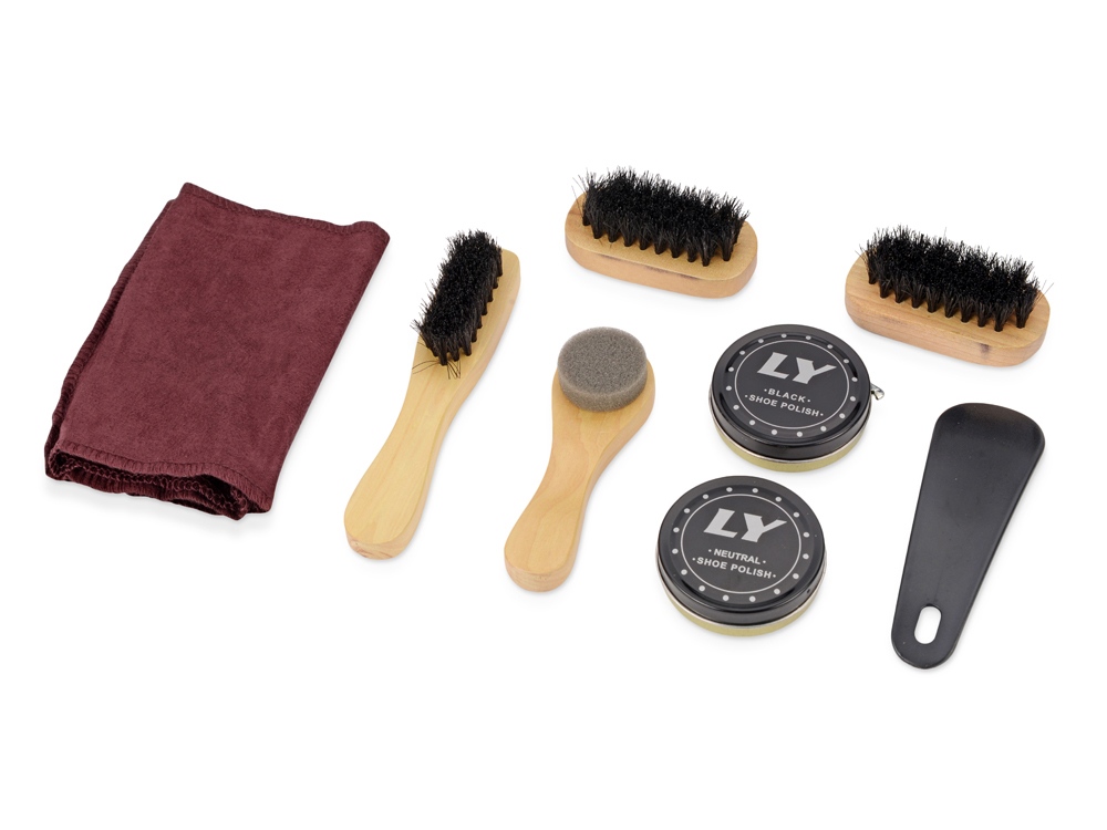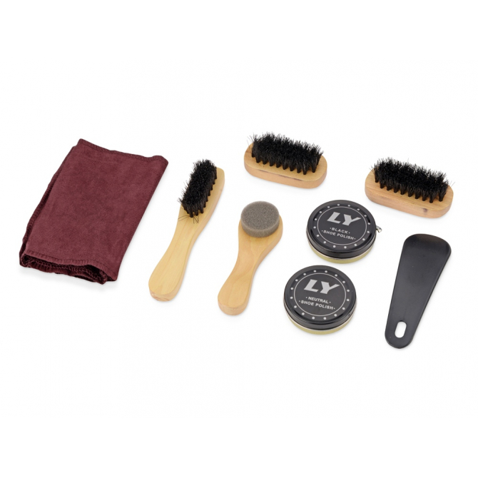 черный крем, бесцветный крем, 1 губка, 3 щетки, ложка для обуви, салфетка