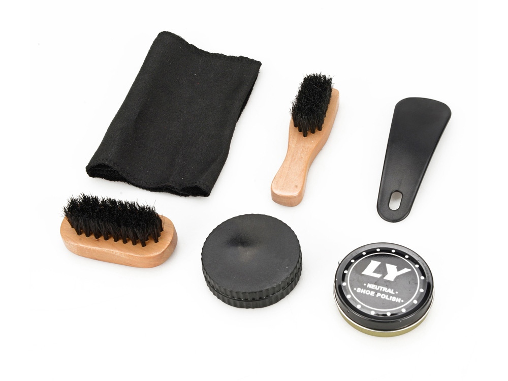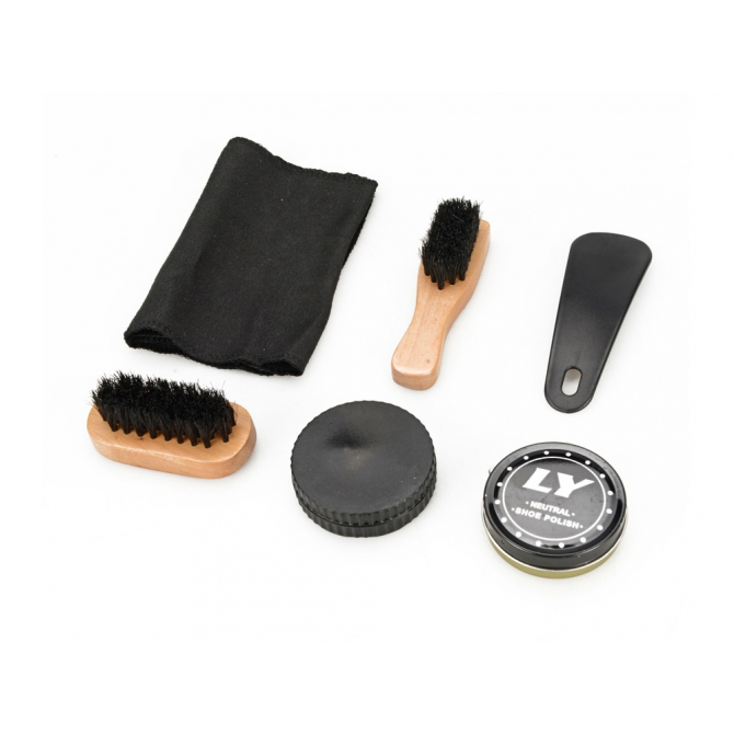 черный крем, бесцветный крем, 2 губки, 2 щетки, ложка для обуви, салфетка