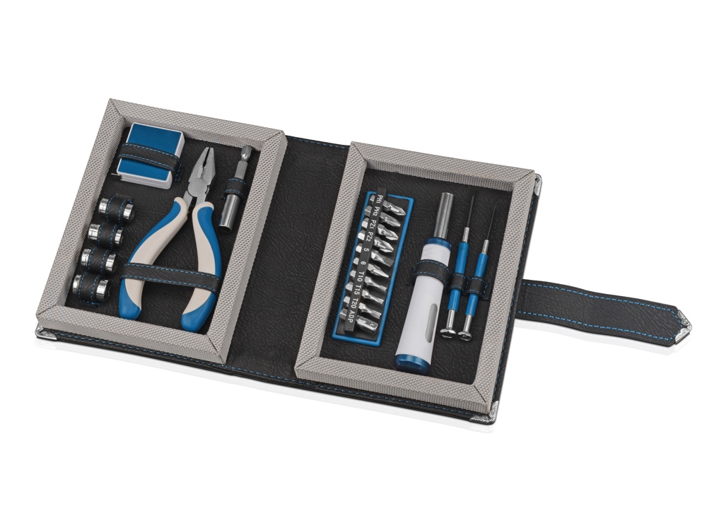 Полезный набор инструментов, состоящий из 20 предметов, компактно размещается в футляре из кожзаменителя в виде книги.  Набор можно возить в машине, брать с собой на дачу, ведь он не займет много места.