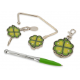 Оригинальный набор с изображением четырехлистного клевера принесет удачу и станет приятным подарком для милых дам. Набор состоит из удобной шариковой ручки, складного и обычного крючка для сумки, крючка для ключей.