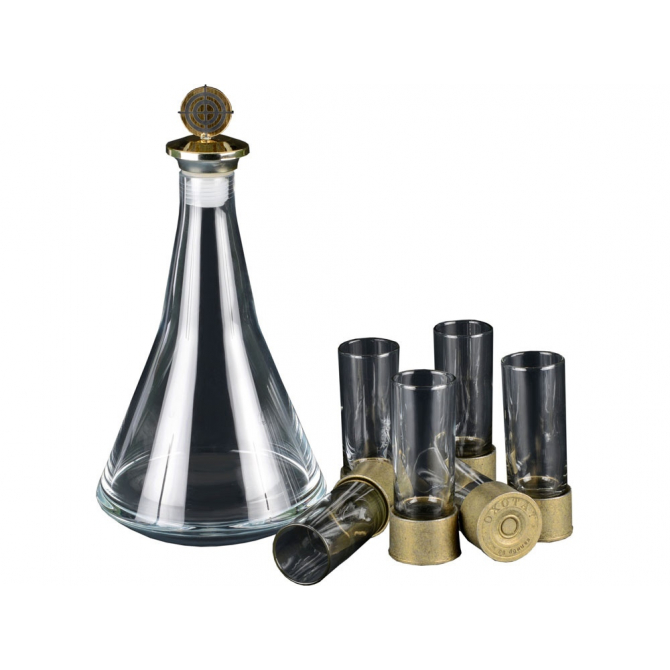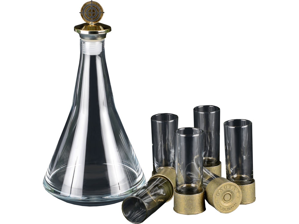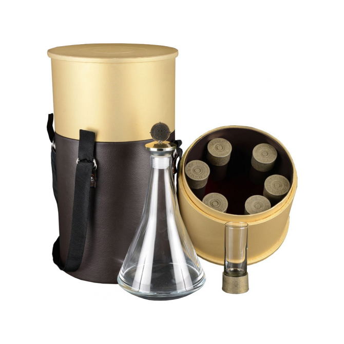 Необычная коробка в виде патрона, а в ней шесть стопок-патронов и графин 700 мл для водки с мишенью. Обычное застолье на охоте или после нее сразу становится очень романтичным.