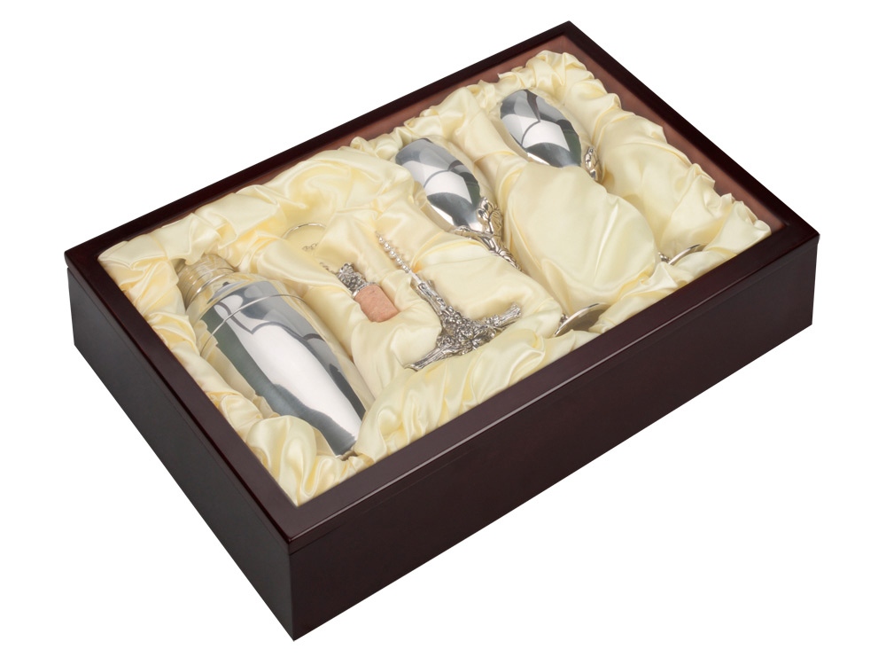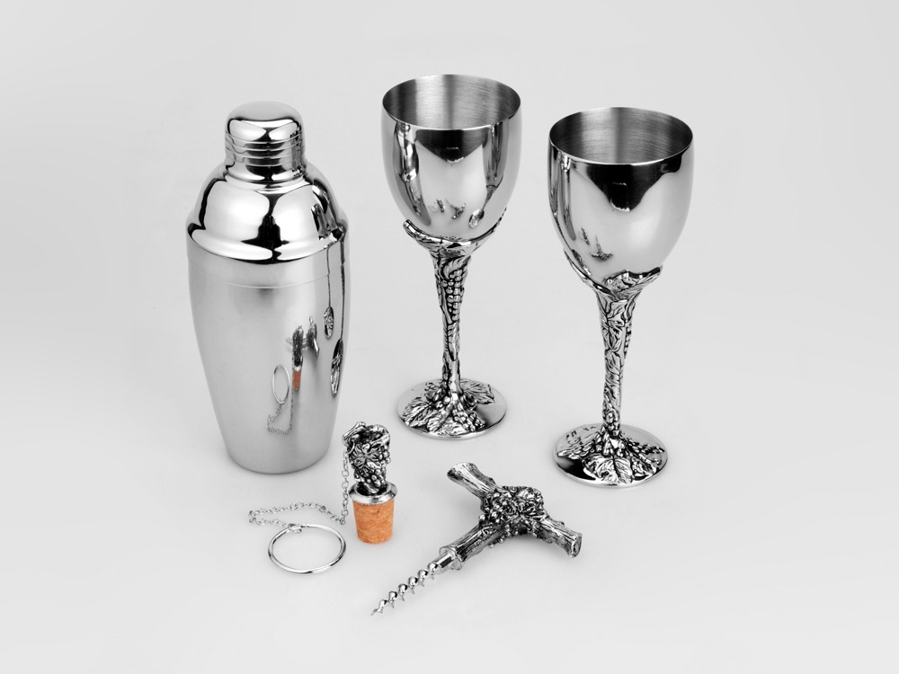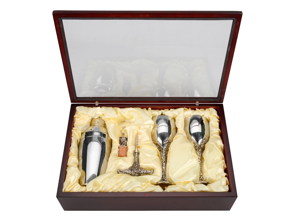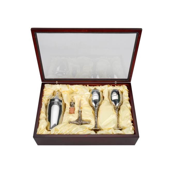 коробка-дерево,шейкер,два бокала,штопор,пробка для бутылки-нержавеющая сталь