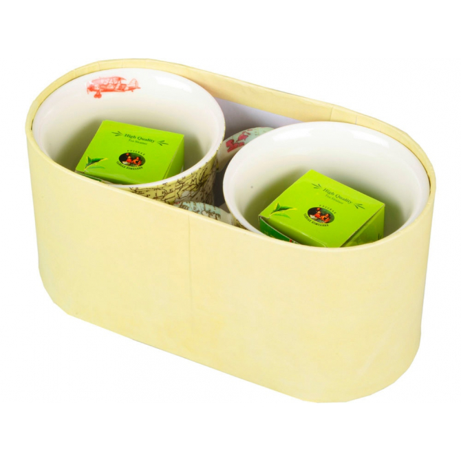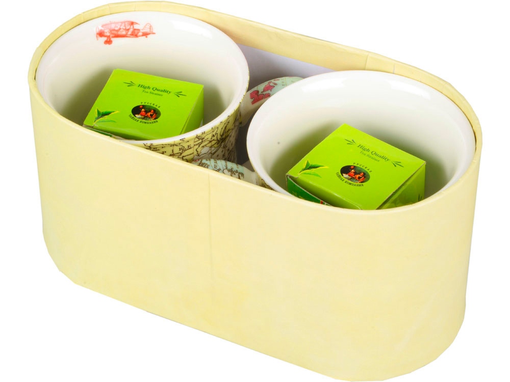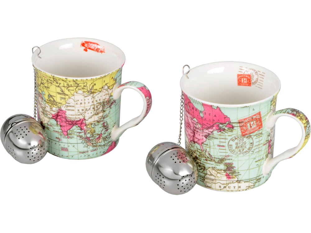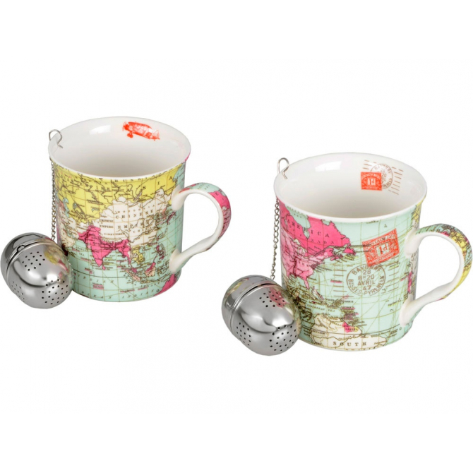 Набор состоит из двух кружек и ситечков для заварки. Кружки из тонкого качественного фарфора украшены изображением карты мира. Заварочные ситечки удобно крепятся к кружкам при помощи крючка и цепочки. Набор упакован в подарочную коробку.