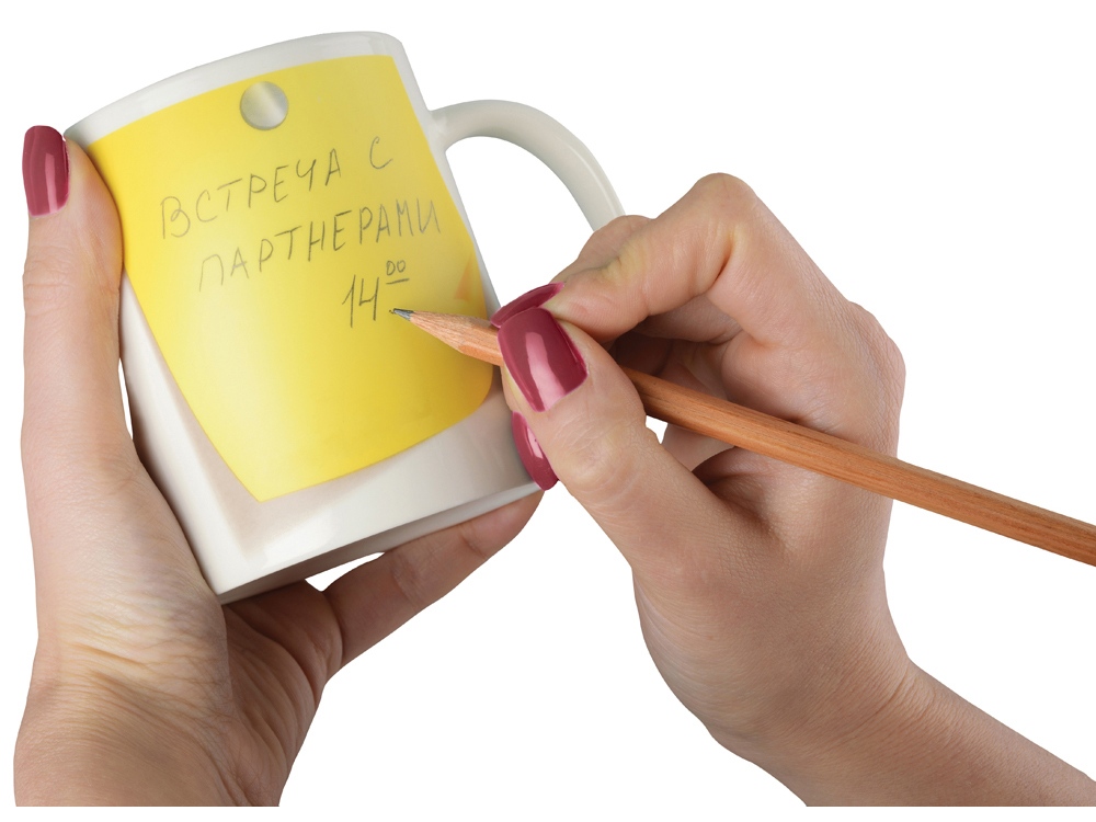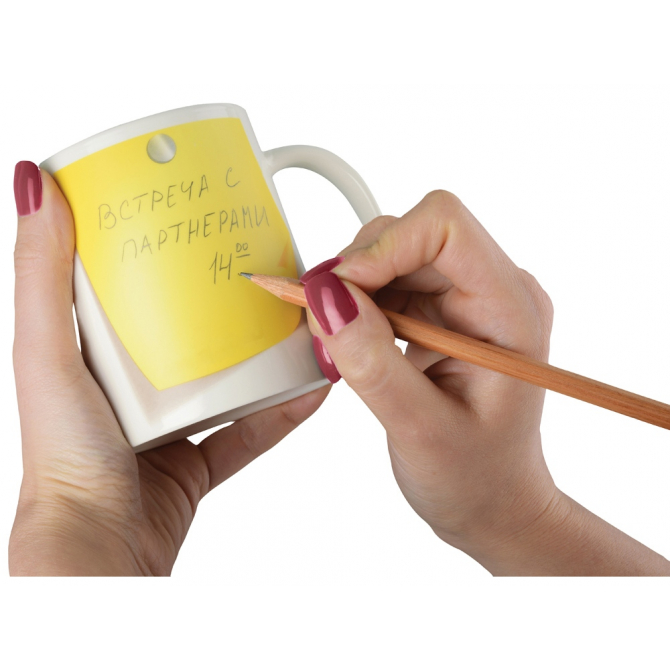 Кружка Оставь заметку! на 320 мл со специальным покрытием для надписей карандашом. Для того чтобы стереть надпись, достаточно ополоснуть кружку в теплом мыльном растворе. Карандаш в комплект не входит