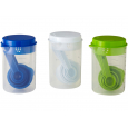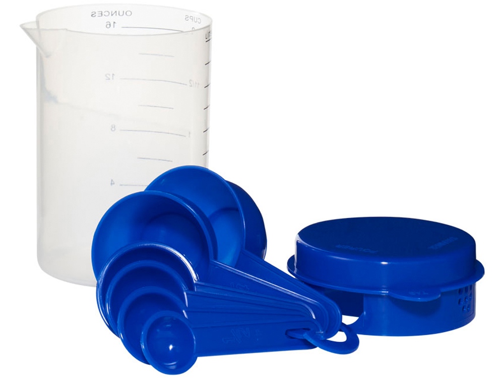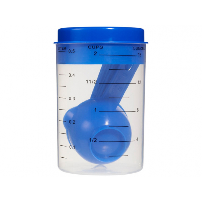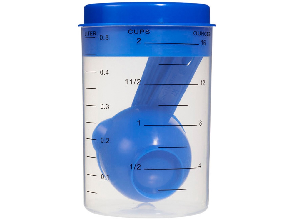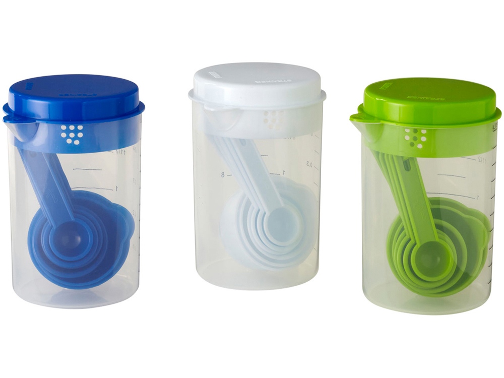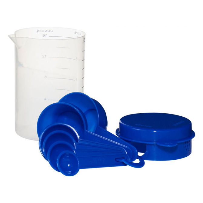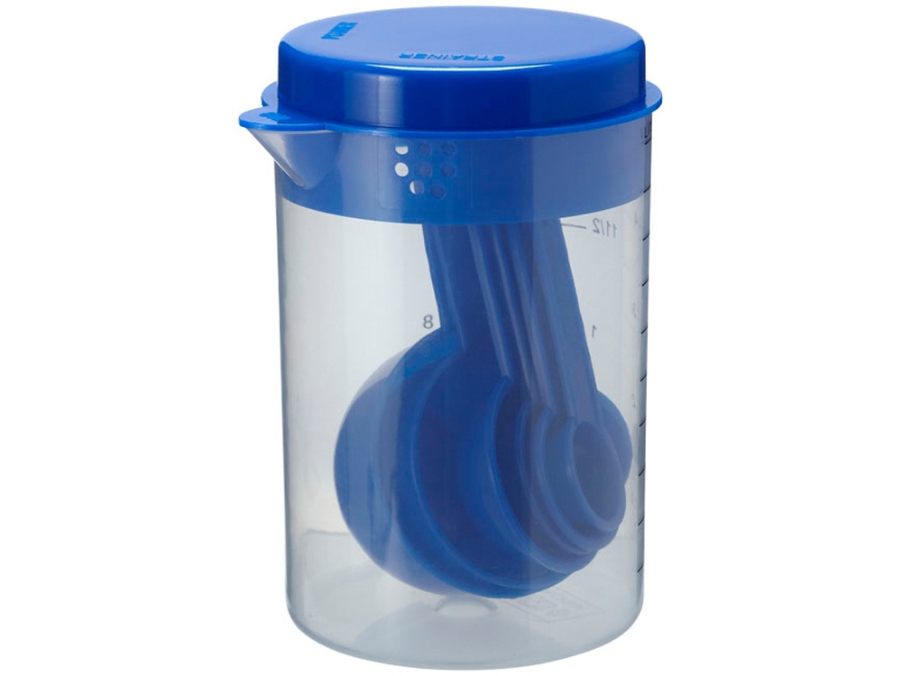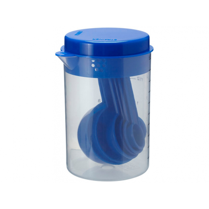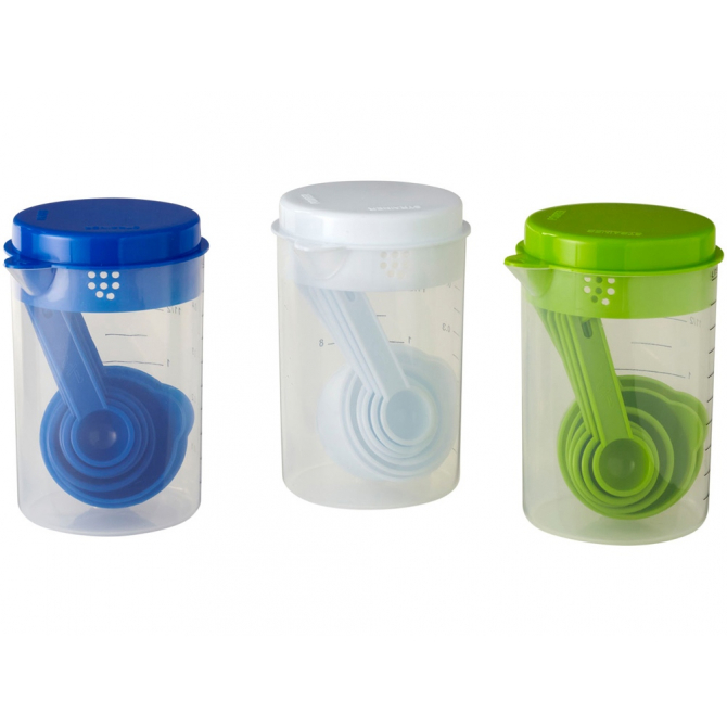 Измерительный набор из 7 предметов. Измерительный набор включает 0,5 литровый контейнер с крышкой, с опциями процеживания, наливания или закрытия контейнера. Внутри контейнера - мерные ложки. Полипропилен.