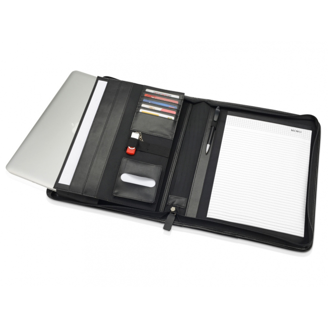 Функциональная и стильная папка для документов будет отличным подарком деловому партнеру. Выполнена из искусственной кожи, на корпус возможно нанесение оригинального тиснение или наложение шильда. Встроенный блок для записей. Удобные карманы для аксессуаров. Особенно удобно уплотненное отделение для планшета.
