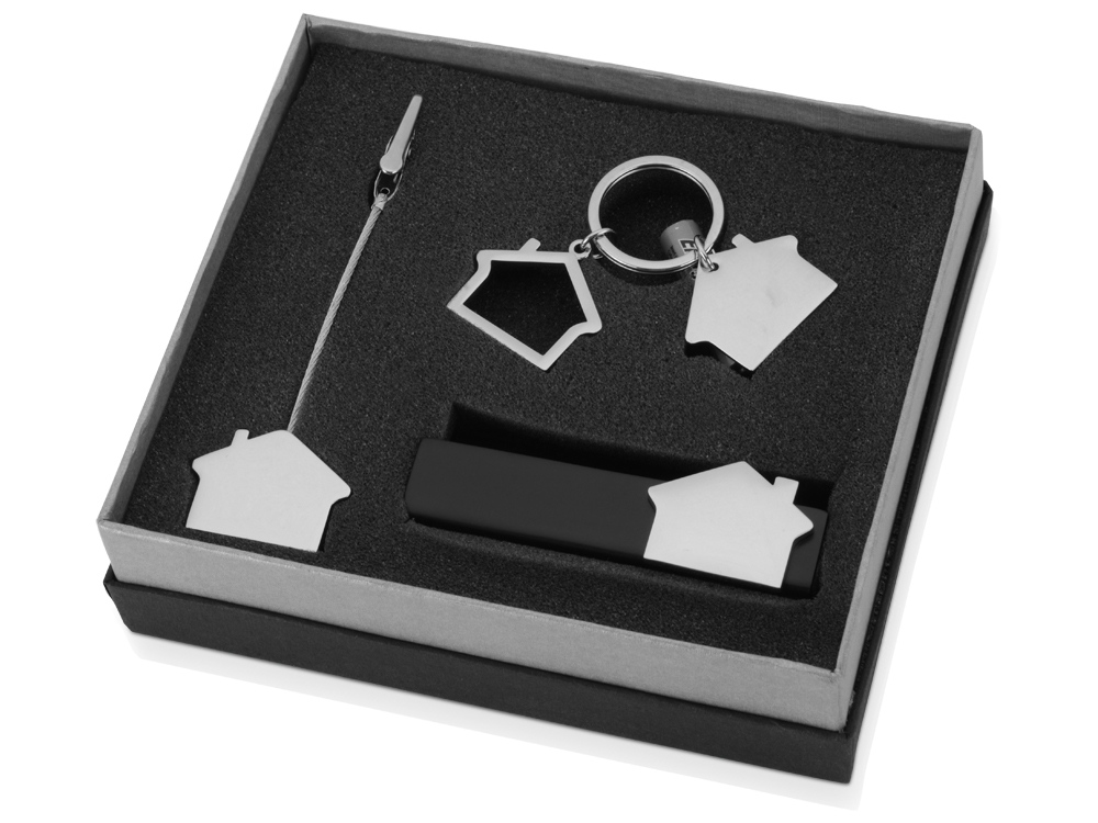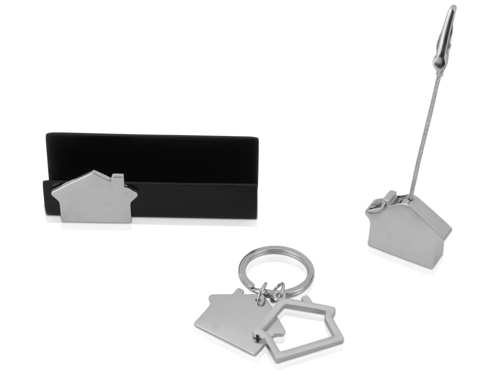 Отличный тематический набор подчеркнет специализацию организации, занятой в строительной сфере, либо ЖКХ. Визитница, брелок и держатель бумаг в форме домика из металла серебристого цвета подойдут не только в качестве подарка, но и для личного пользования.