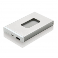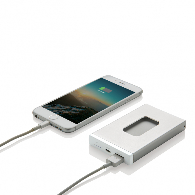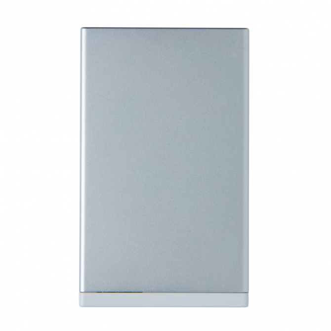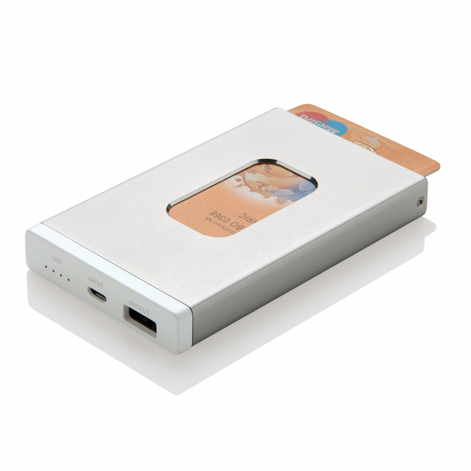 Зарядное устройство с аккумулятором емкостью 2500 мАч с отделением для визиток и карт. Корпус изготовлен из прочного ABS-пластика с металлическим покрытием. Вмещает до 6 визиток, которые легко вставлять и вынимать. На выходе – 1 В/1 А, на входе – 5 В/1 А. Поставляется с кабелем micro-USB.