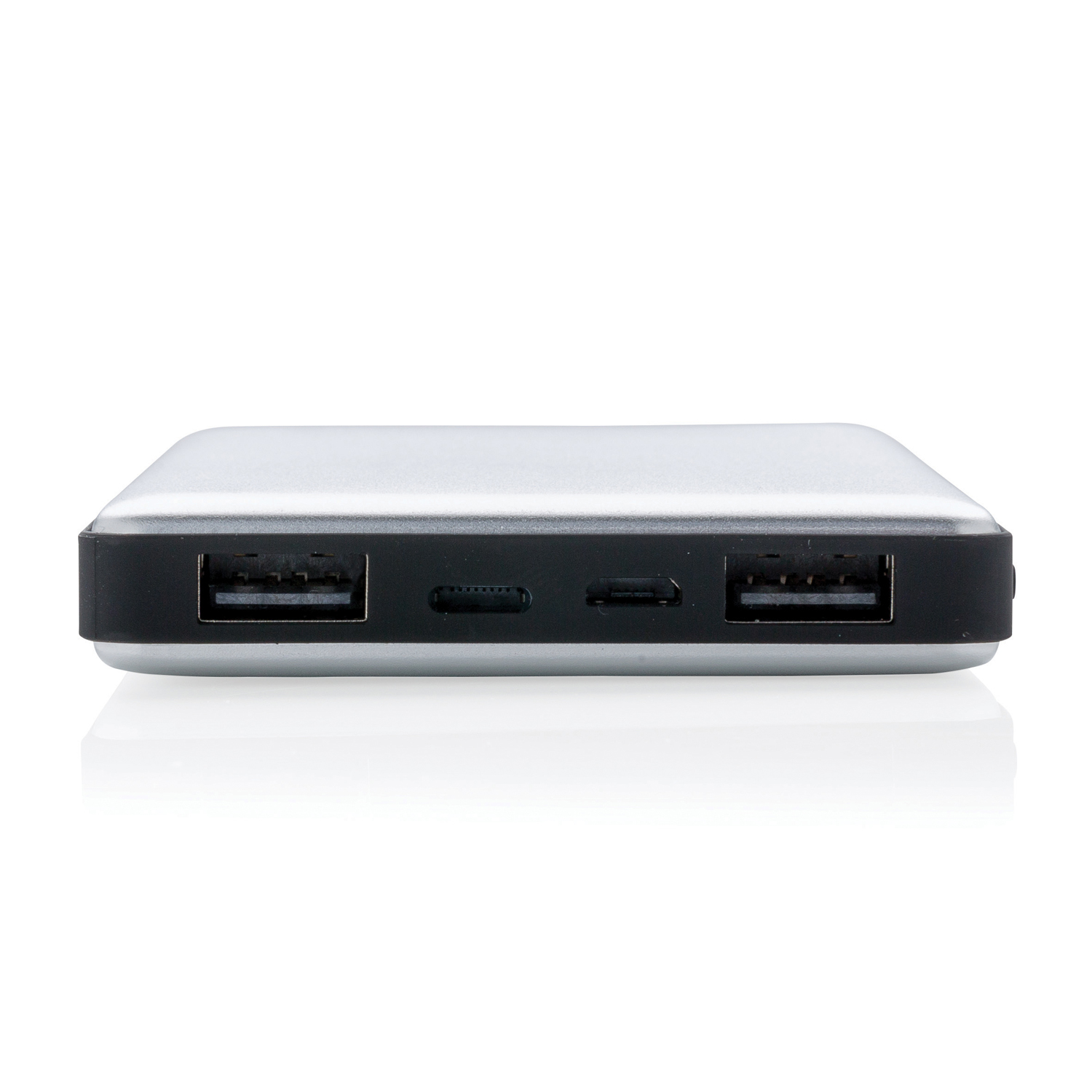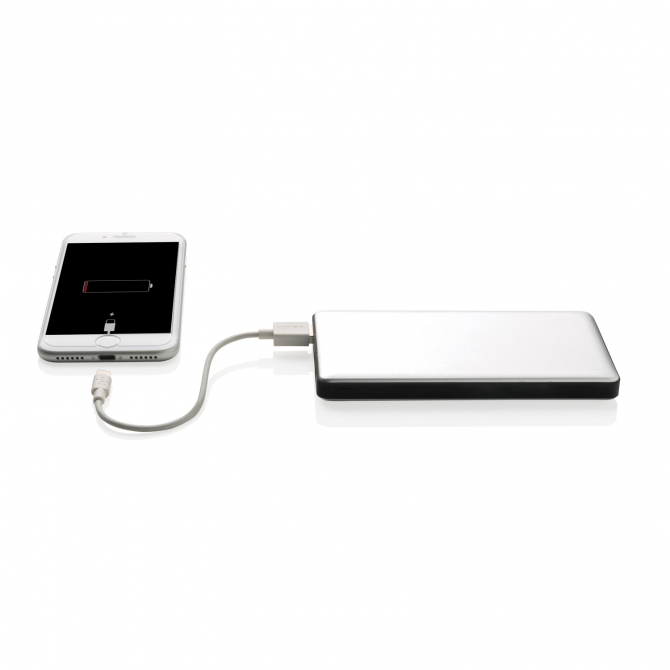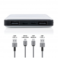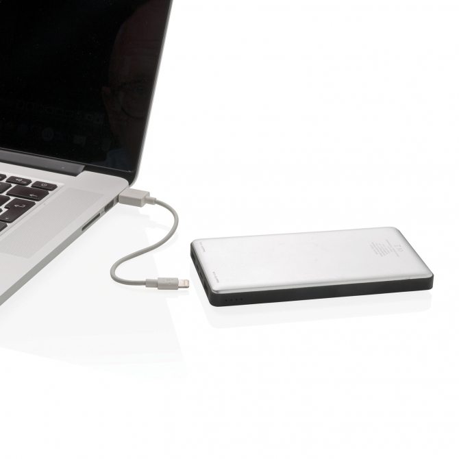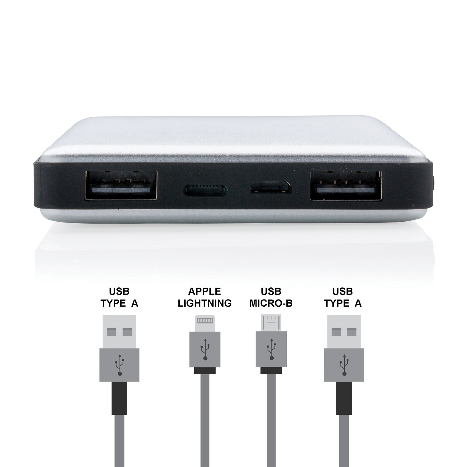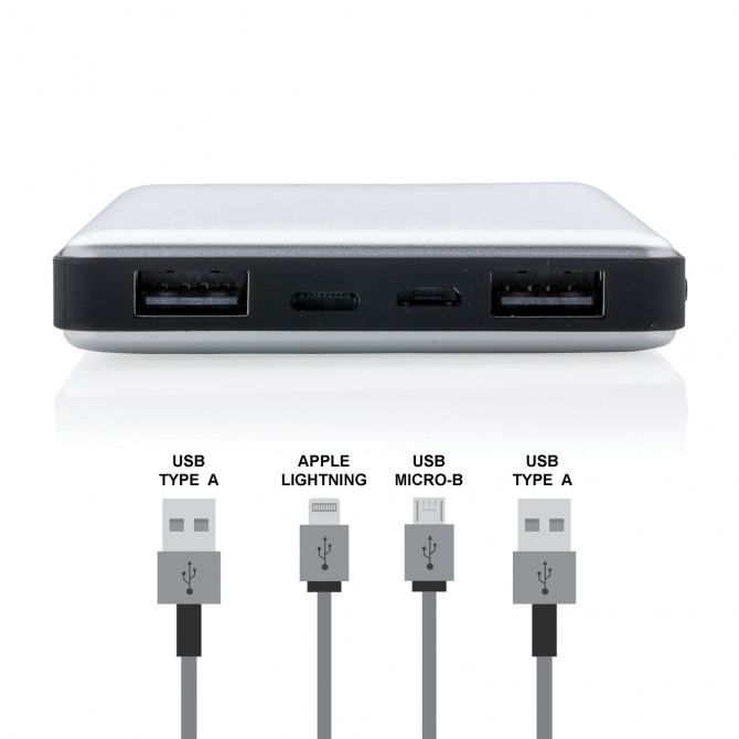 Зарядное устройство со встроенным литий-полимерным аккумулятором емкостью 10 000 мАч изготовлено из алюминия. Помимо двух USB – выходов, позволяющих заряжать два устройства одновременно, в нем присутствуют еще и два входа – micro-USB и lightning. Это особо оценят пользователи продукции Apple, ведь для подзарядки устройства они могут использовать тот же кабель, которым заряжают телефон или планшет (кабель в комплекте не идет). Это зарядное устройство подходит как для смартфонов, так и для планшетов. Удобный световой индикатор на корпусе показывает уровень заряда. Напряжение на выходе составляет DC 5V/2.4A, на входе - 5V/2A.