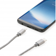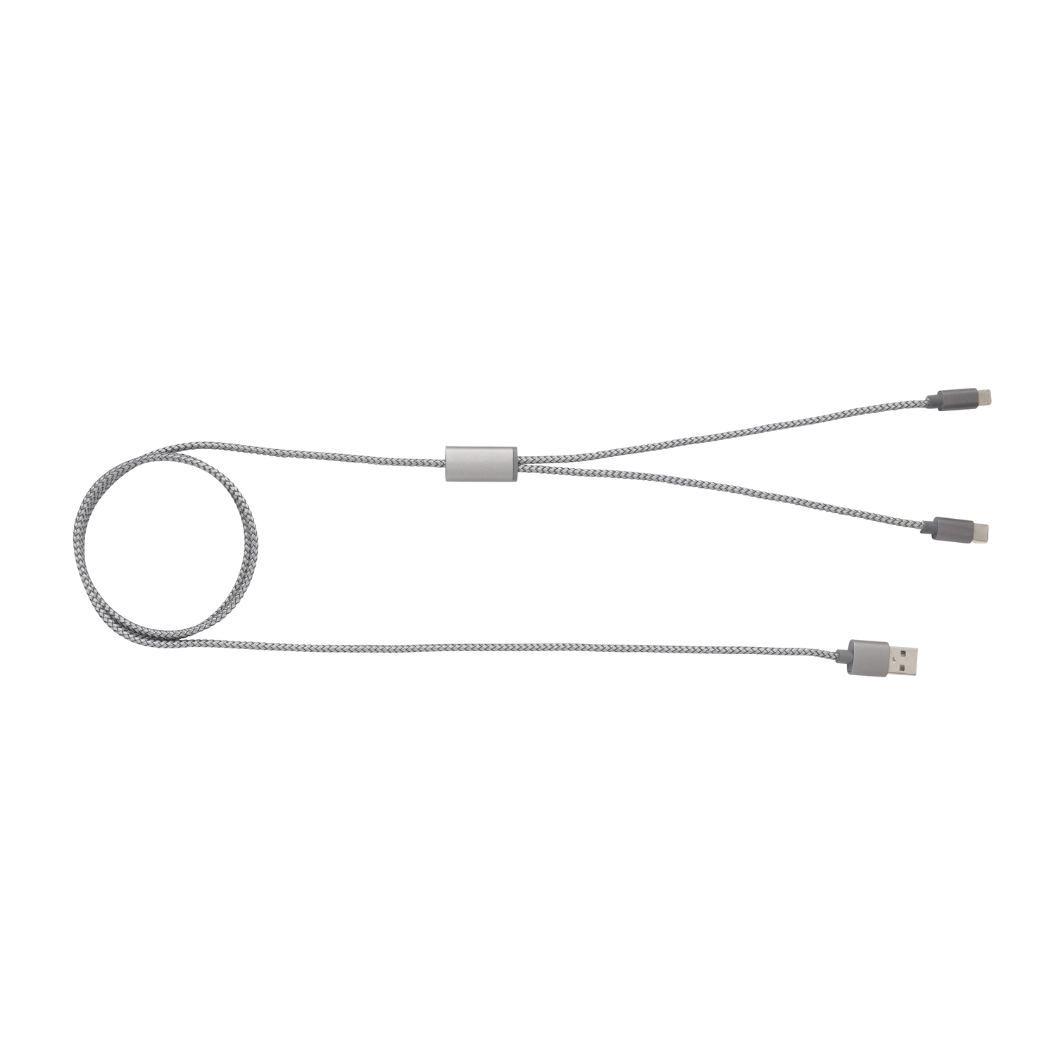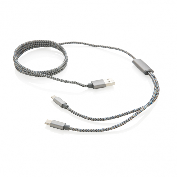 Плетеный кабель превосходного качества 3-в-1. В нем предусмотрены три выхода: Type C и двусторонный разъем - для устройств на платформе iOS и на платформе Android (micro USB). Сам кабель изготовлен из плетеного нейлонового материала, разъемы - из прочного алюминия. Подходит для зарядки устройств. Длина – 120 см.