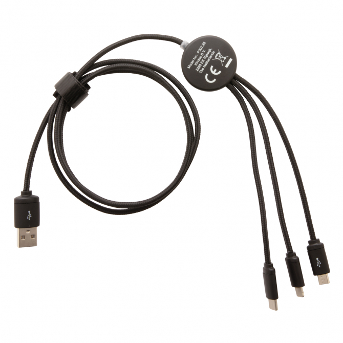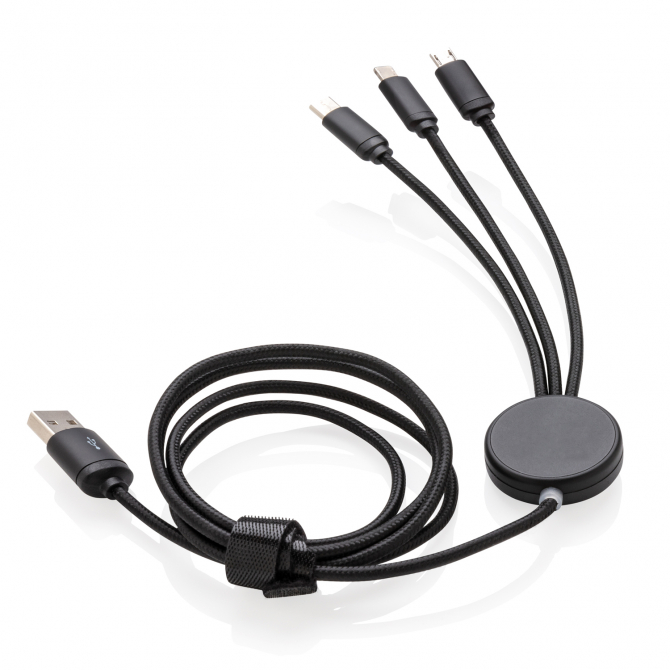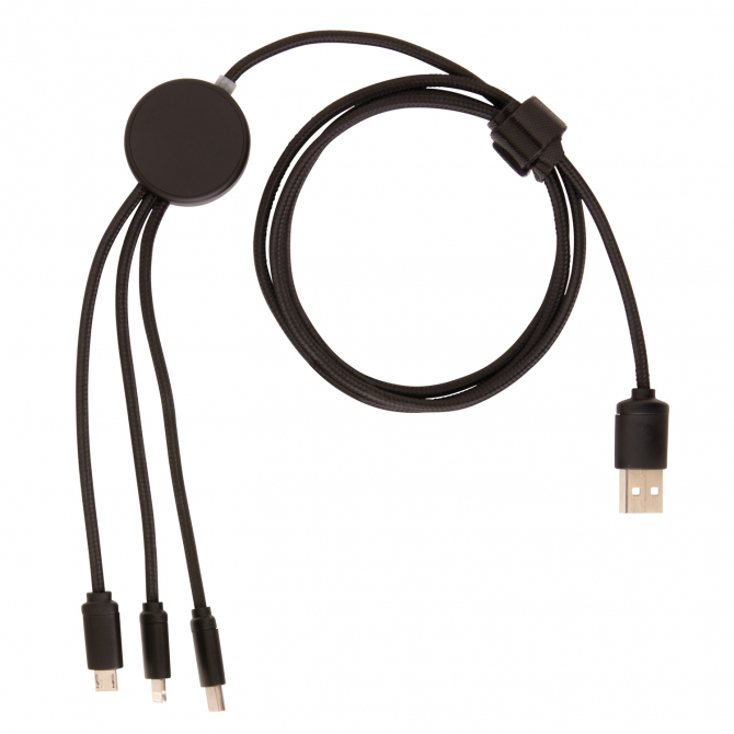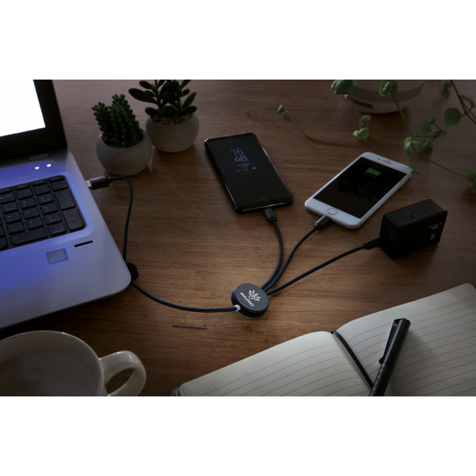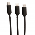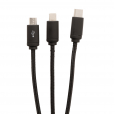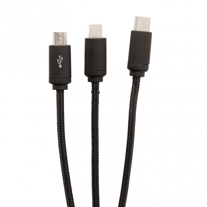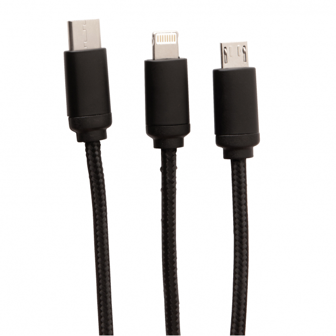 Кабель 3 в 1 превосходного качества с оплёткой из нейлонового материала, разъёмы изготовлены из прочного алюминия. У этого девайса предусмотрены три выхода: Type C , разъемы для устройств на платформе iOS и на платформе Android (micro USB). На кабеле расположен специальный индикатор для Co2 гравировки. Индикатор будет подсвечивать ваш логотип во время использования кабеля. Подходит для зарядки устройств. Длина – 120 см.