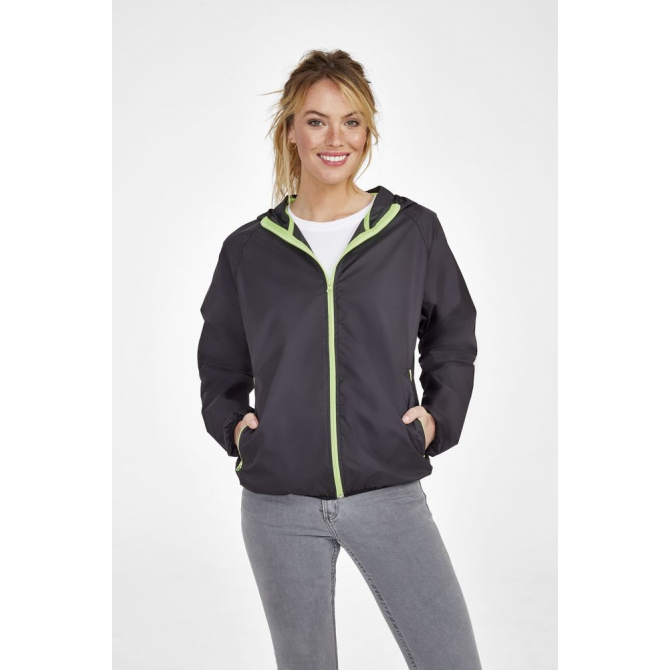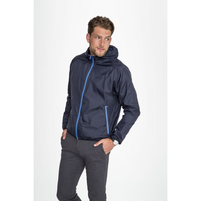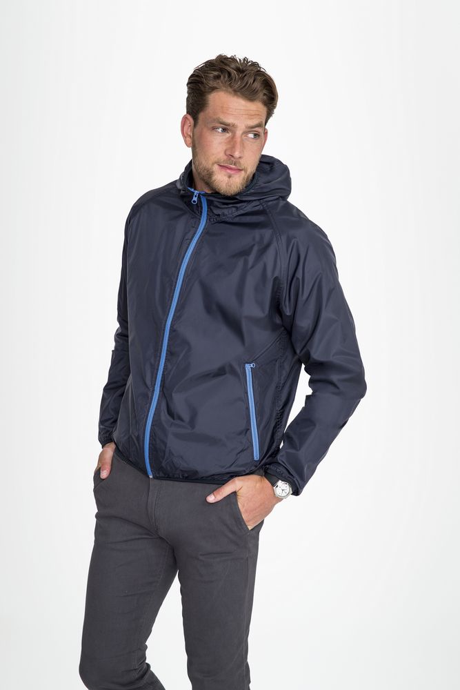 Молнии контрастного цвета. Манжеты, капюшон и низ ветровки на эластичной тесьме.