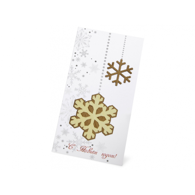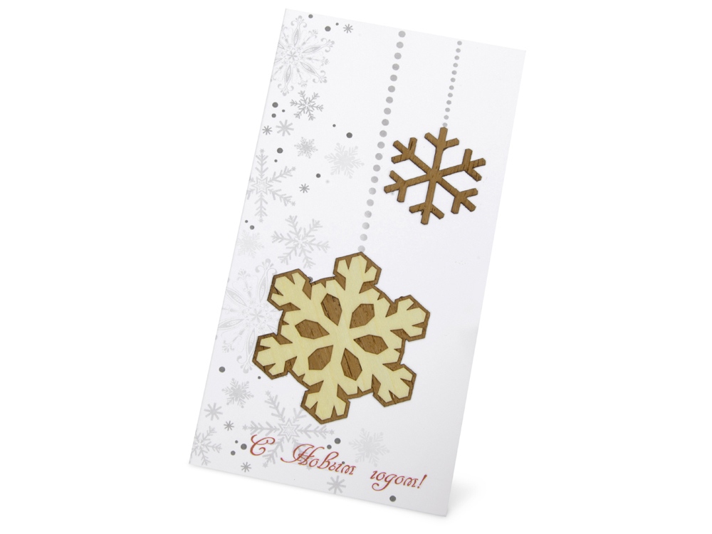 Оригинальная открытка Новогодние снежинки будет отличным дополнением для любого подарка. Объемная аппликация из шпона подчеркнет стремление вашей компании к творческим решениям.