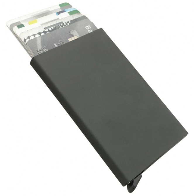 Футляр с выдвижным механизмом имеет защиту RFID. Вмещает 6 карточек.